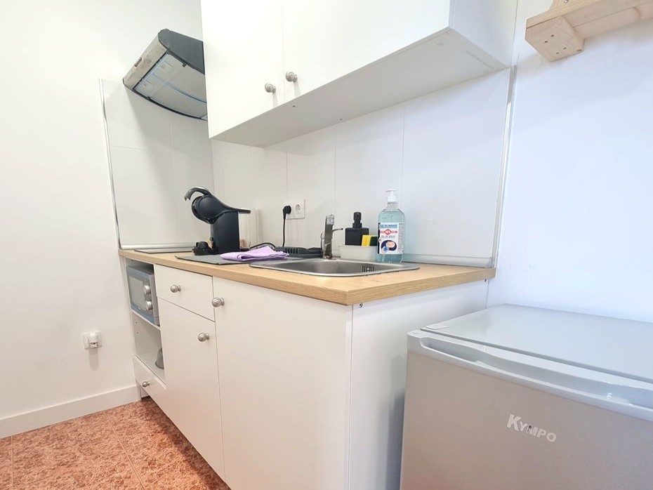 Con zona común, que incluye cafetera, televisión, cocina, aseo y mesa comedor y terraza.