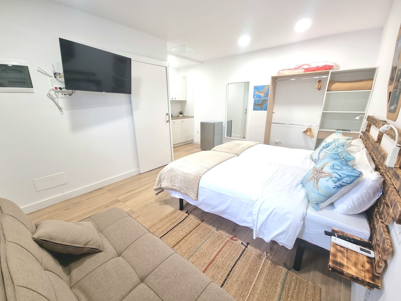 Cama de 150cm, equipada con sofá cama. Cocina con frigorífico, microondas, vitrocerámica y todos los utensilios necesarios para que tu estancia sea perfecta.